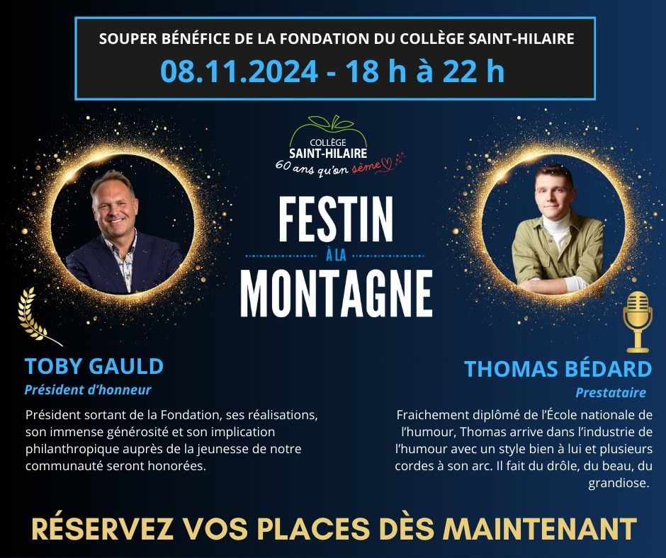 Sous le thème du 60e anniversaire du Collège, la seconde édition du 𝓕𝓮𝓼𝓽𝓲𝓷 𝓪̀ 𝓵𝓪 𝓜𝓸𝓷𝓽𝓪𝓰𝓷𝓮 réunira plus de 150 invités pour un souper gastronomique sous la responsabilité de Monsieur Roland Bambach, chef propriétaire de Calibré Cuisine.