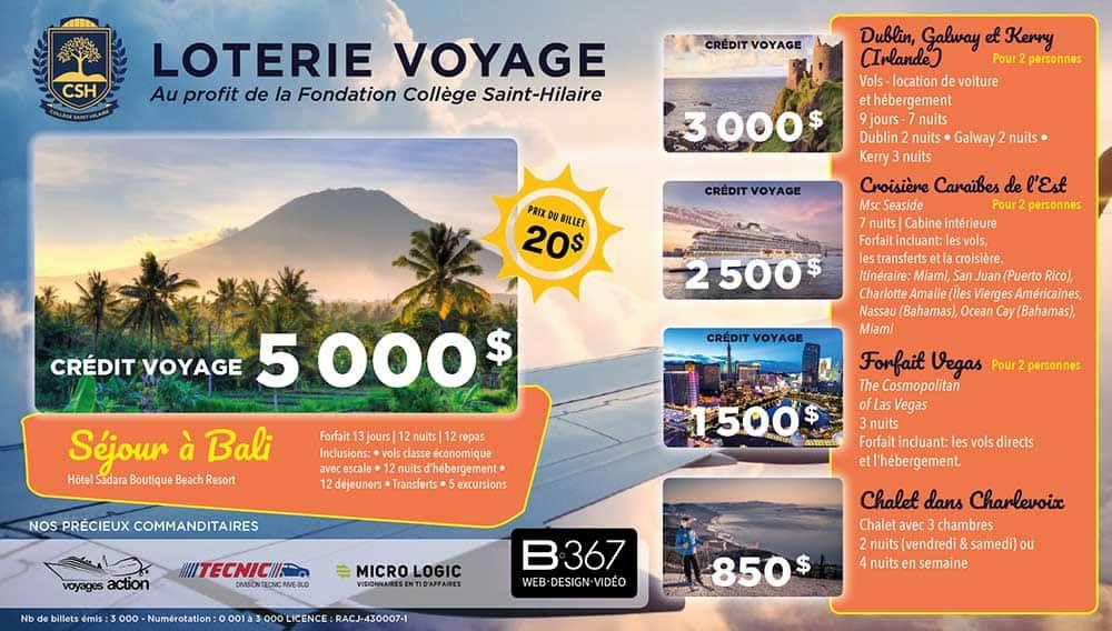 La 7e édition de la LOTERIE VOYAGE de la Fondation Collège Saint-Hilaire est maintenant lancée! Encouragez la réalisation de projets demandés par les élèves et courez la chance de gagner de fabuleux prix. Voici les projets de la Fondation 2019-2020: ⇒ Climatisation d’un grand nombre de locaux ⇒ Démarrage d’un Fab Lab