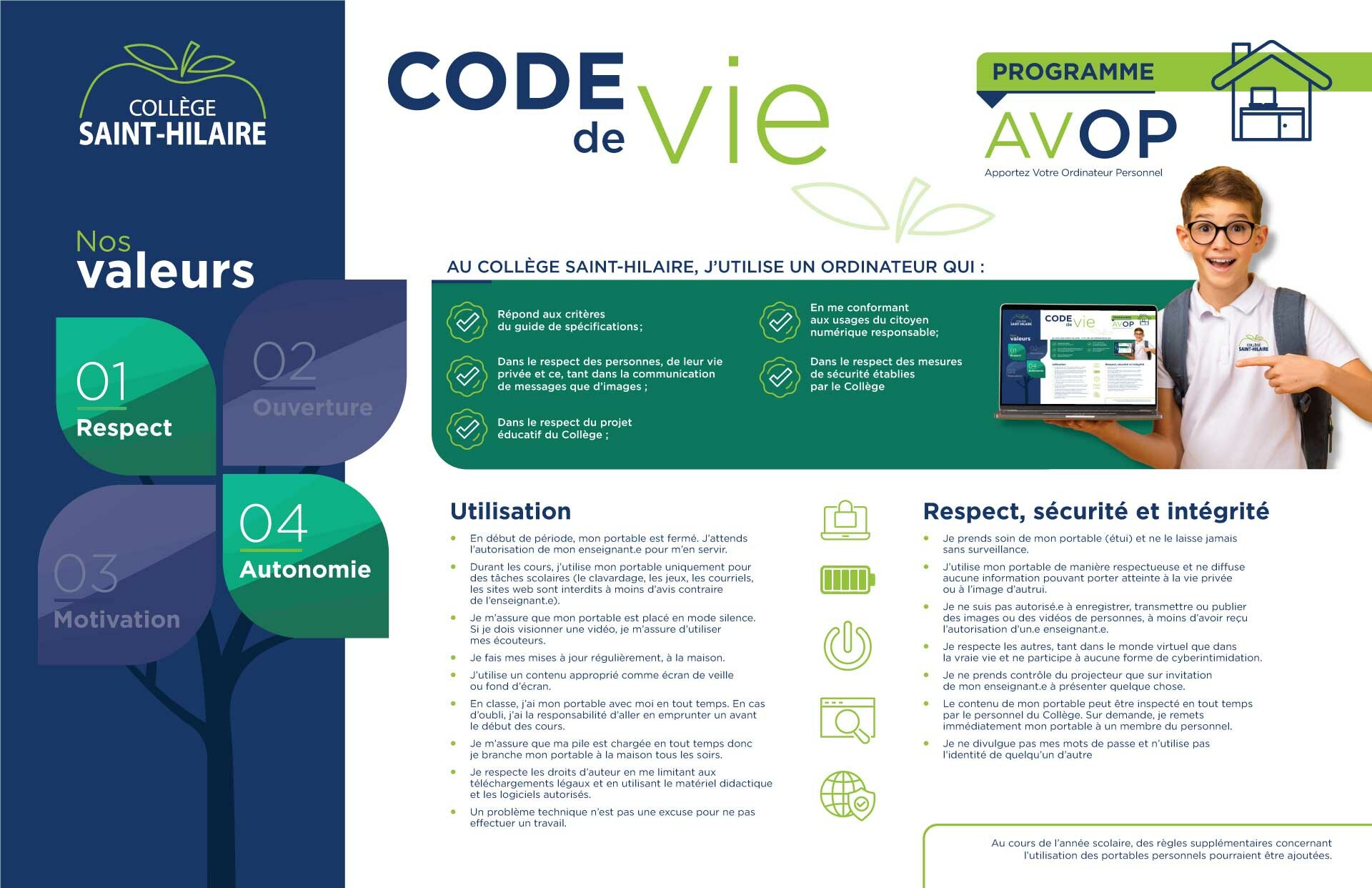 Dans le cadre du programme AVOP, les élèves du Collège utilisent leur propre ordinateur portable pour leurs apprentissages scolaires. Cette initiative, encadrée par une politique claire, vise à refléter les exigences et les pratiques qu’ils retrouveront dans leurs études postsecondaires et leur futur milieu de travail. L’accès fluide aux ressources pédagogiques, le développement de l’autonomie et la responsabilisation dans la gestion de leur appareil et de leur environnement de travail font partie intégrante de cette approche.