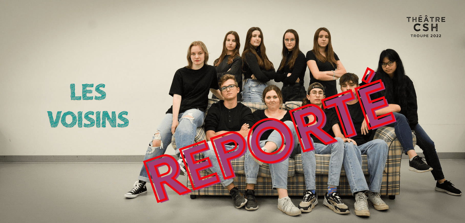 En raison des mesures sanitaires qui seront toujours en vigueur les 23 et 24 février prochains, nous sommes dans l’obligation de reporter la présentation de la troupe de théâtre du CSH. Ce n’est que partie remise! LES VOISINS, c’est un moment de plaisir assuré, signé Claude Meunier et Louis Saïa. À suivre…