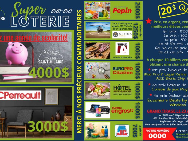 La Fondation Collège Saint-Hilaire remercie les personnes qui se sont procuré l’un des 2 477 billets vendus de la Super Loterie 2020-2021.